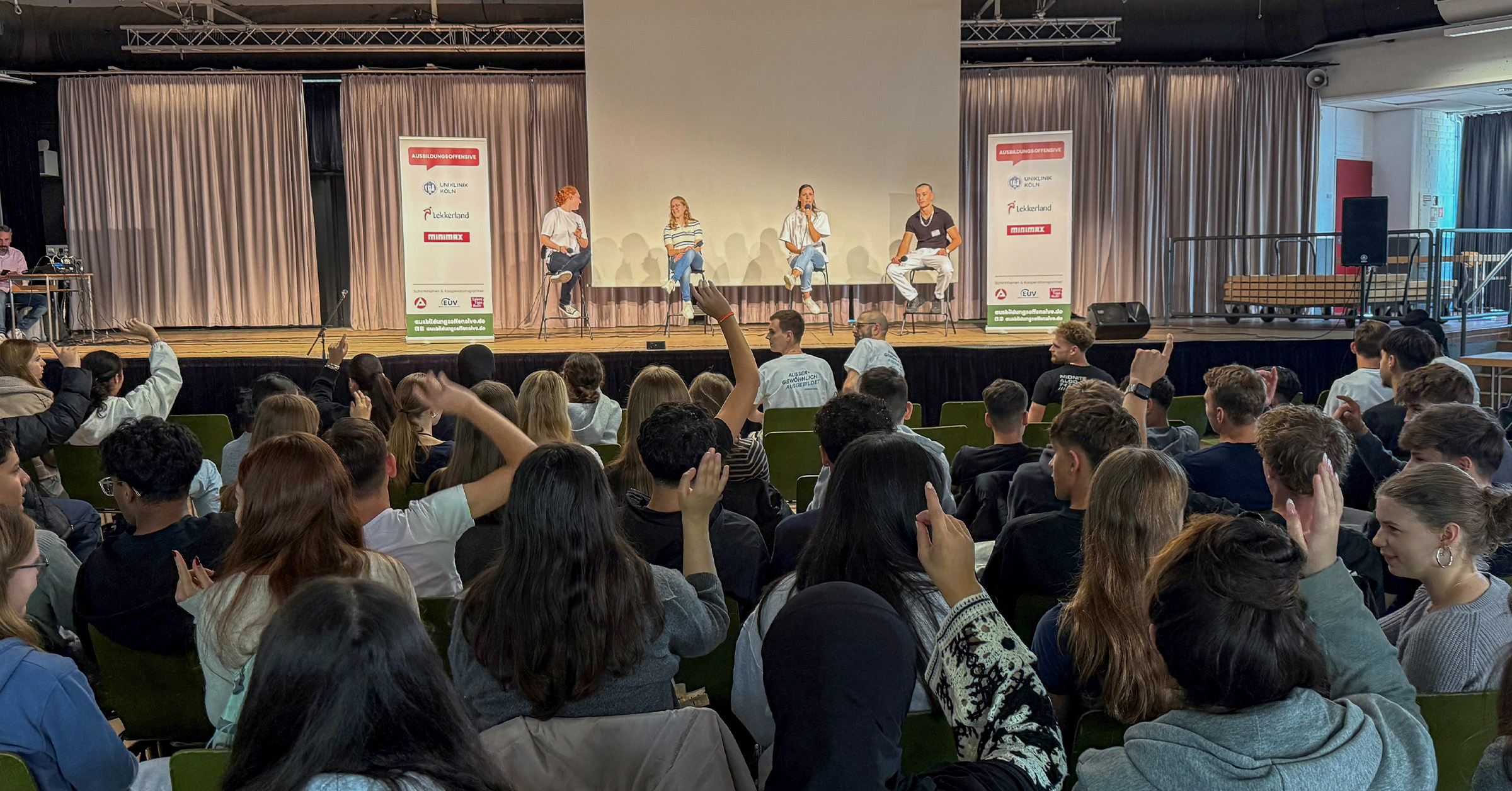 Zum Auftakt dieser Sek-II-Tour in Köln präsentierten sich Lekkerland, das Uniklinikum Köln sowie Minimax den Oberstufenschülern – mit vielfältigen Einblicken in Ausbildungsberufe und duale Studiengänge. Ob Logistik, Gesundheit oder Brandschutz: Die Branchen waren ebenso unterschiedlich wie die Werdegänge der jungen Azubis und Dualstudierenden, die auf der Bühne aus ihrem Alltag berichteten.