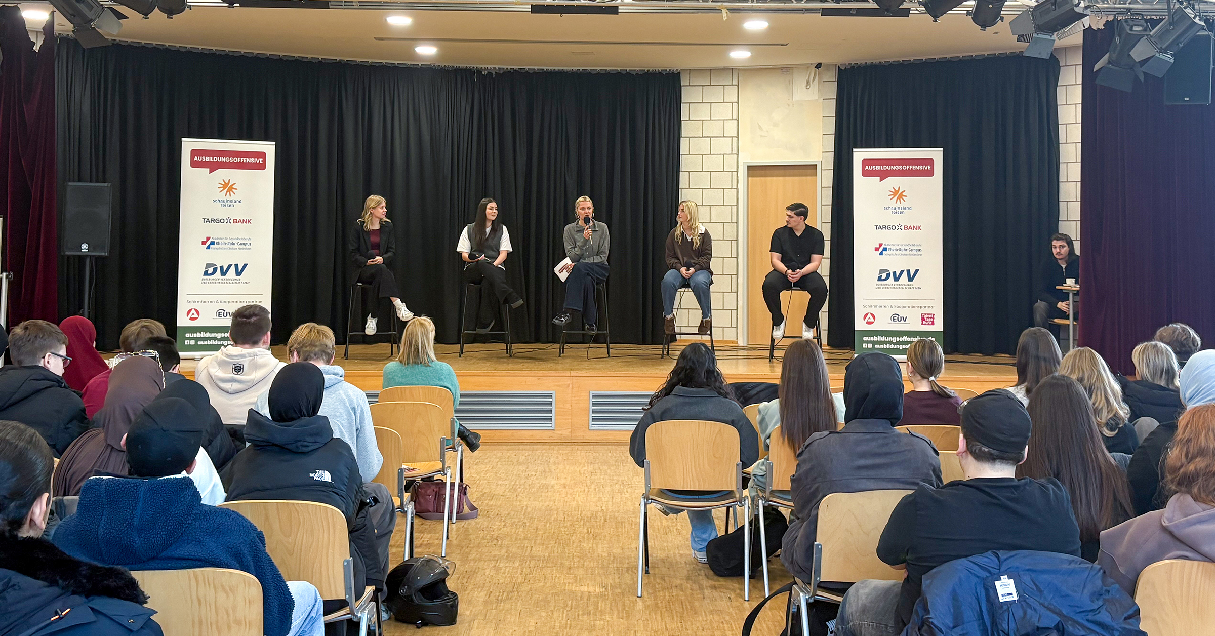 Mit dabei: die TARGOBANK, die Duisburger Versorgungs- und Verkehrsgesellschaft (DVV), die Evangelischen Kliniken Niederrhein sowie schauinsland-reisen. Alle vier Betriebe nutzten das Format, um direkt mit Jugendlichen ins Gespräch zu kommen – sowohl auf der Bühne im Talk als auch an den Unternehmensständen im Anschluss.