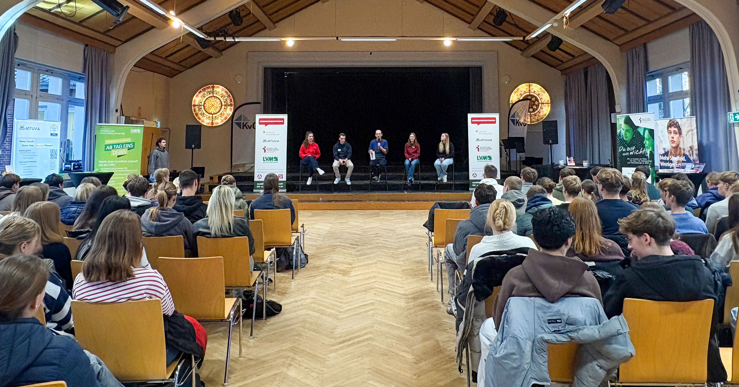 Mit 130 Schülern der Jahrgangsstufe Q1 war das Kardinal-von-Galen-Gymnasium Gastgeber unseres nächsten Münsteraner Tourstopps. Der Fokus lag auch diesmal auf authentischen Einblicken in Ausbildung und duales Studium – geliefert von Azubis und dual Studierenden aus vier ganz unterschiedlichen Branchen.