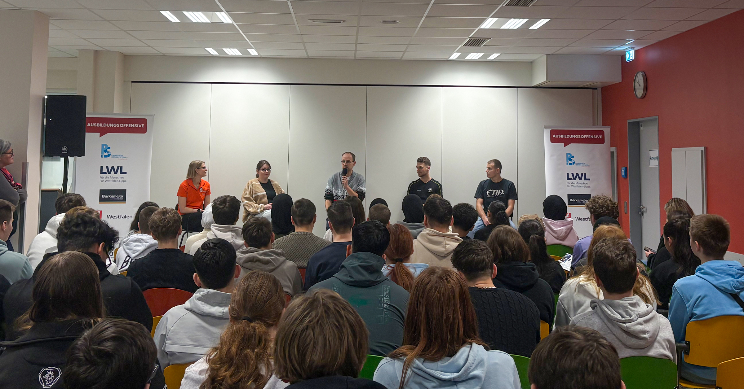 Mit dabei waren das Autohaus Berkmeier, der Landschaftsverband Westfalen-Lippe (LWL), die Westfalen AG und die Evangelische Perthes-Stiftung. In einer Talkshow berichteten aktuelle Azubis von ihrem beruflichen Alltag, Einstiegsmöglichkeiten und Ausbildungswegen – vom sozialen Bereich bis zur Industrie. Besonders aufschlussreich: Die Schülerinnen und Schüler erfuhren, welche Voraussetzungen man für die Pflege-Ausbildung bei der Perthes-Stiftung mitbringen sollte, was den Arbeitsalltag in einem Autohaus auszeichnet oder welche dualen Wege der LWL oder die Westfalen AG bereithalten.