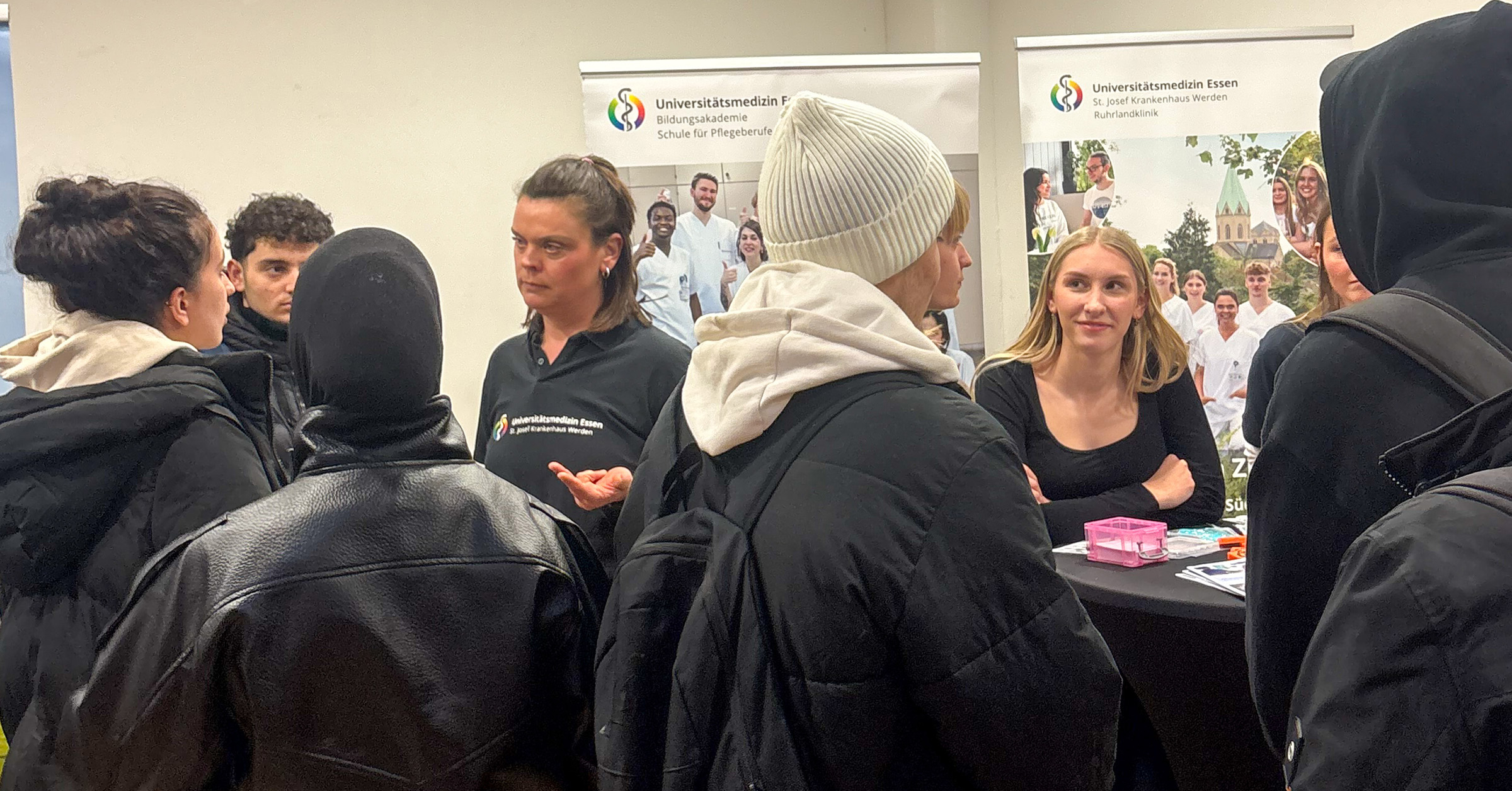 Vertreten waren die Sparkasse Essen, die Jugendhilfe Essen, die Emschergenossenschaft sowie das Universitätsklinikum Essen. Auf der Bühne berichteten Azubis und Dualstudierende aus ihrem Alltag: von kaufmännischen Abläufen im Finanzwesen, vom Einstieg in soziale Arbeitsfelder, von technischen und ökologischen Aufgaben rund um Wasserwirtschaft und Infrastruktur oder von ersten Praxiserfahrungen im Krankenhaus. Dabei ging es nicht nur um Berufsbilder, sondern auch um persönliche Wege, Herausforderungen im Bewerbungsprozess und Entwicklungsmöglichkeiten nach der Ausbildung.